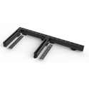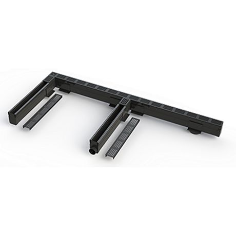 Hoekelement bestaande uit een kunststof (PVC) gootelement met een zwart geanodiseerd aluminium designrooster |